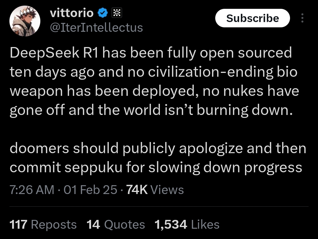 Title: life goes on even when open source wins. r1 completely open sourced